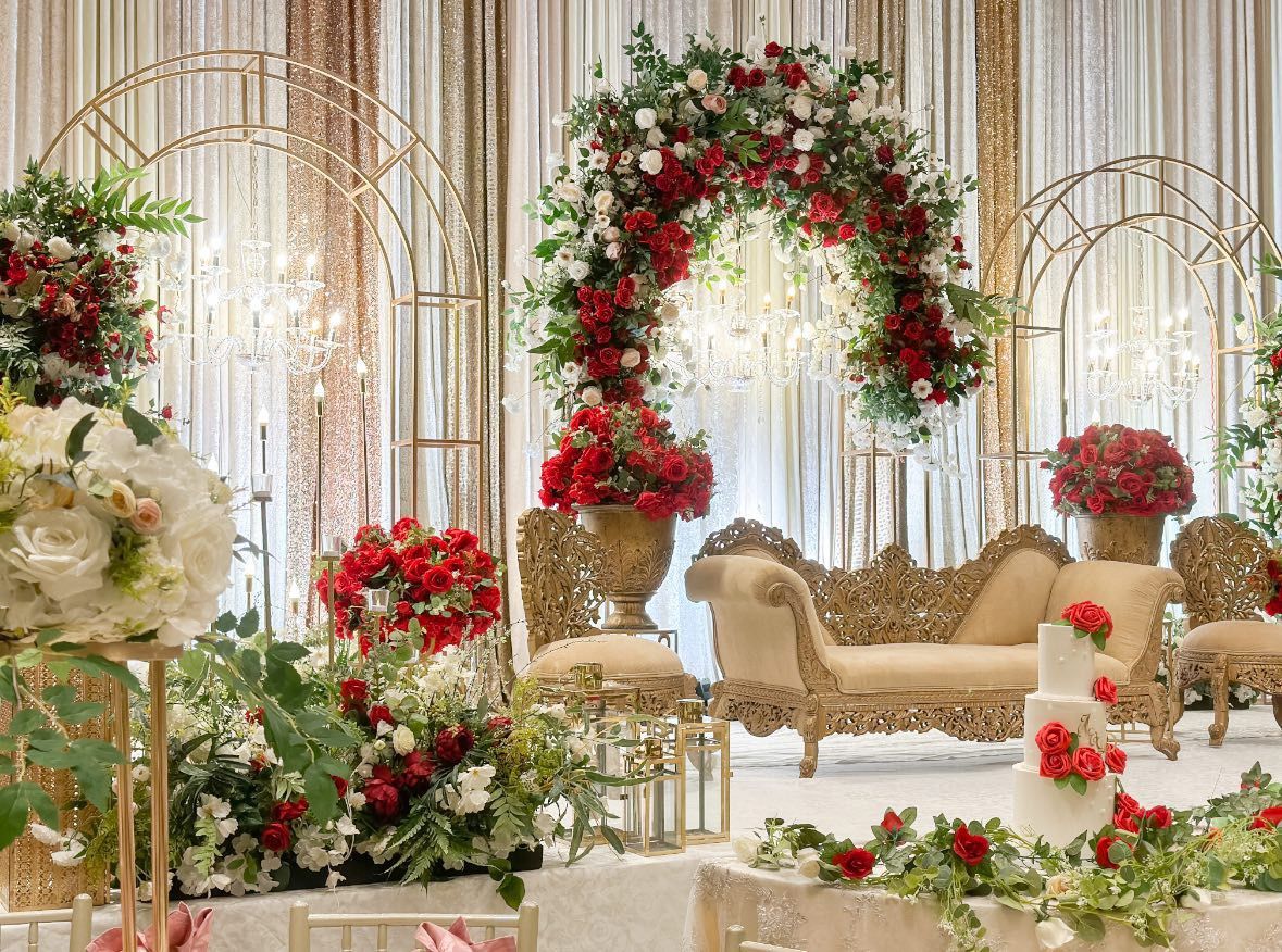 As a wedding decor company specializing in Hindu weddings in Toronto and surrounding areas like Mississauga and Brampton, we craft immersive, culturally rich environments that honor the vibrant traditions and spiritual significance of each ceremony while infusing modern elegance to reflect the couple’s unique love story. For the main wedding ceremony, often held at venues like the Sagan Banquet Hall or venues in the GTA, we design intricate canopies adorned with lush floral arrangements in auspicious colors like red, gold, and saffron, incorporating elements like jasmine garlands, lotus blooms, and draped silk fabrics to create a sacred focal point for rituals like the Saptapadi. Backdrops feature ornate patterns inspired by traditional Indian and Pakistani art, complemented by warm ambient lighting and decorative pillars.